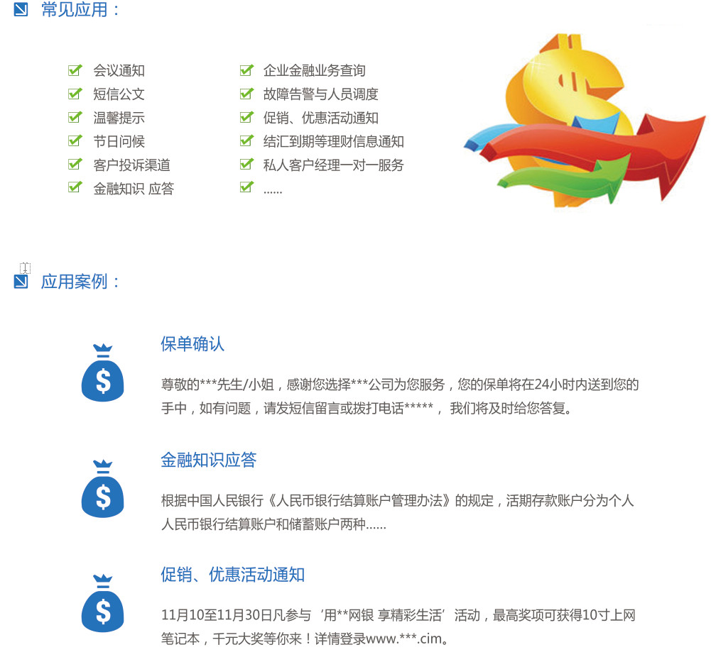 把短信与银行业务紧密的连接起来,提升了银行的服务质量和企业品牌,丰富了业务手段,提高了工作效率,塑造行业新形象。不仅如此,通过短信还可以扩大银行的沟通渠道,建立与客户实时的沟通机制,进一步提高客户的忠诚度,使用户摆脱了时空限制,且操作直观清晰,功能齐全,安全性高,成本低,效率高;它的引入将全面提升服务水平,提高行业内的竞争力。